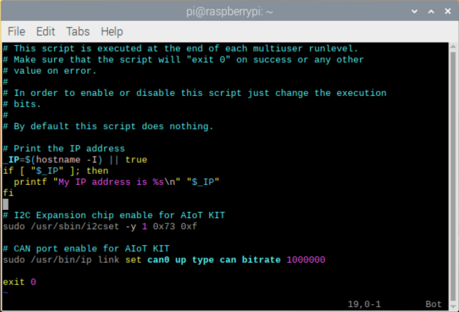 # Print the IP address _IP=$(hostname -I) || true if [ "$_IP" ]; then printf "My IP address is %s\n" "$_IP" fi # I2C Expansion chip enable for AIoT KIT sudo /usr/sbin/i2cset -y 1 0x73 0xf # CAN port enable for AIoT KIT sudo /usr/bin/ip link set can0 up type can bitrate 1000000 exit 0 |