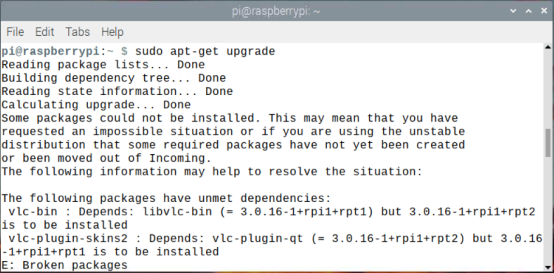 vlc-bin : Depends: libvlc-bin (= 3.0.16-1+rpi1+rpt1) but 3.0.16-1+rpi1+rpt2 is to be installed