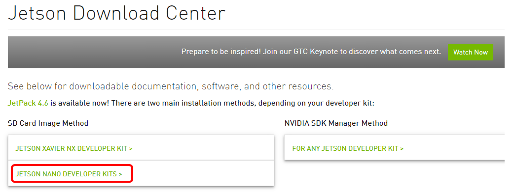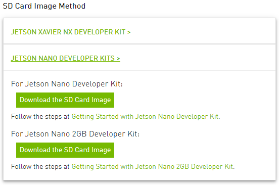 그리고 JETSON NANO Developer를 클릭하면 두종류의 이미지를 받을 수 있다. 일반형 모델과 저가형 모델(RAM 2GB)를 선택할 수 있다.