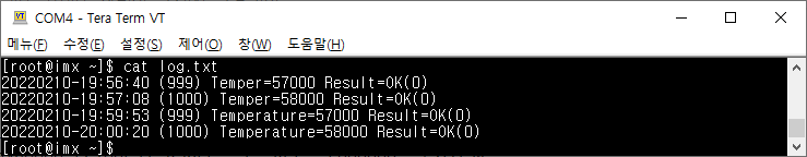 온도값을 포함시키면 좀더 있어보인다. 아래는 온도를 넣으려고 count.txt를 수정해서 두번씩 테스트한 결과 파일 내용이다.  온도도 표시되고 Result의 상수값도 괄호에 포함시켜 출력하였다.