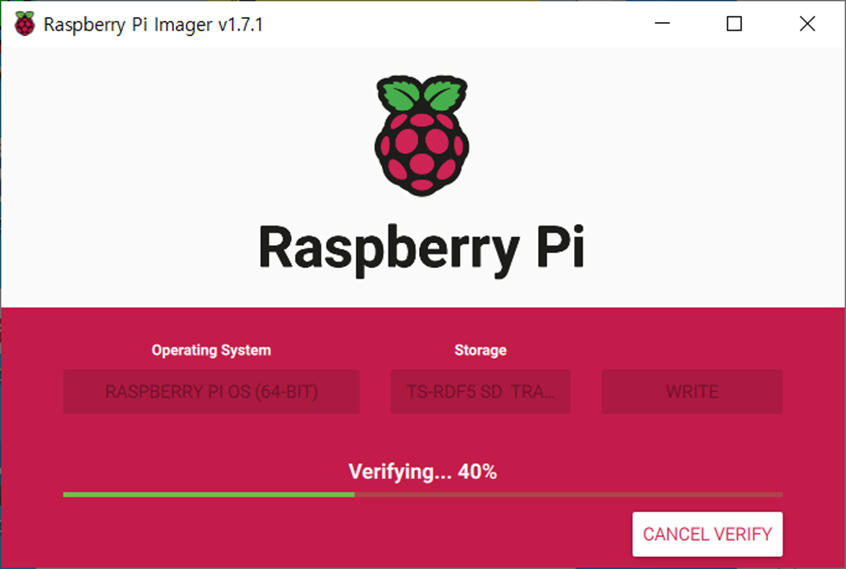 필자는 64비트 이미지를 이용할 예정이므로, Operating System 항목을 Raspberrt Pi OS (64Bit) – Full 버전을 선택하고 PC에 라즈베리 파이에서 사용할 USB 메모리 또는 MicroSD를 연결 후 Storage 항목에서 해당 드라이브를 선택해주고 Write 버튼을 클릭하여 64비트 라즈베리파이 운영체제를 지정한 메모리에 기록하게 된다.