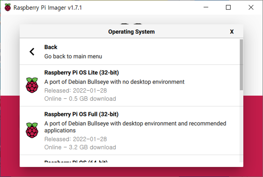어떤 운영체제를 기록할 수 있는지 확인해보자. 라즈베리파이 32비트 버전을 선택할 수 있다. 이건 기존과 동일하니 크게 감동은 없고..