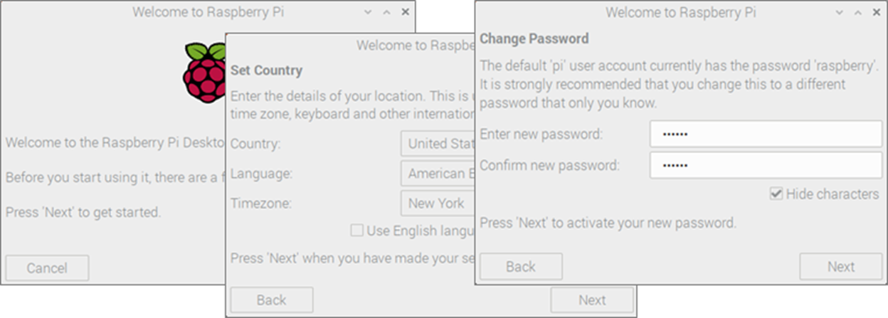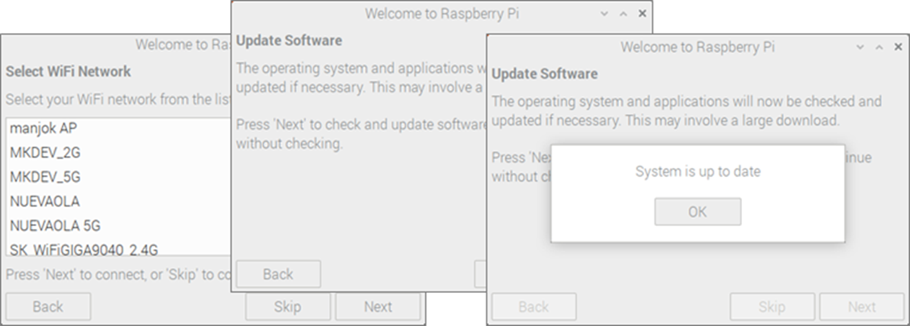 다음은 라즈베리파이에 메모리를 넣고 부팅해주도로 하자. 그리고 기본 셋팅을 해주자. 부팅이 되면 기본 설정 다이얼로그가 출력된다. 간간히 중요하지 않은 화면은 생략하고 주요 설정 부분 위주로 설명하자면 아래와 같다.