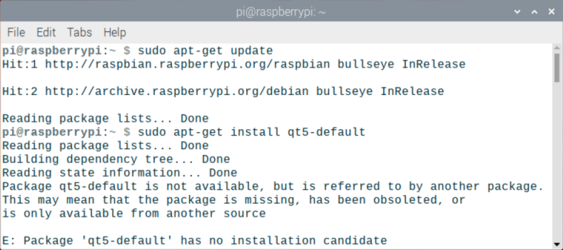 pi@raspberrypi:~ $ sudo apt-get install qt5-default