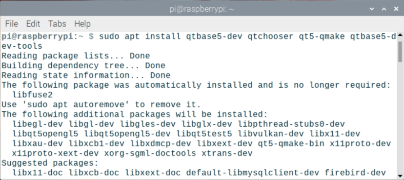 pi@raspberrypi:~ $ sudo apt install qtbase5-dev qtchooser qt5-qmake qtbase5-dev-tools