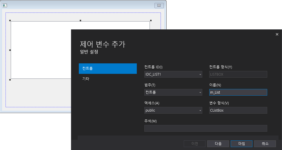 리스트 컨트롤에서 컨트롤키를 누르고 마우스 우클릭을 아래와 같이 제어변수를 추가할 수 있다. 이때 이름에서 m_List를 입력해주면된다.