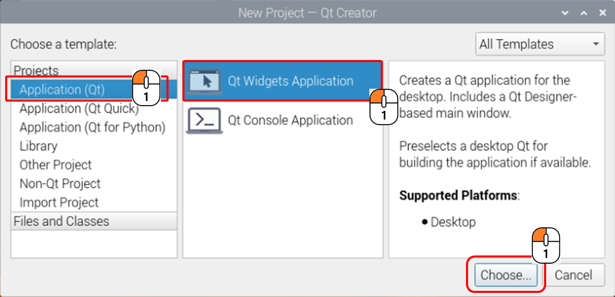 필자는 CPP기반의 전형적인 Qt를 진행할 예정이므로 템플릿은 Application (Qt) > Qt Wdiget Application 순으로 선택한다음 Choose버튼을 클릭한다.