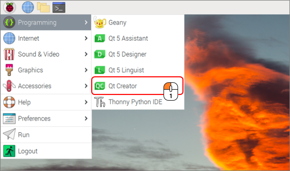 라즈베리파이가 OS x64를 설치하고, QT와 Webengine까지 설치한 다음 진행하면 된다. QT관련 패키지가 정상적으로 설치되었다면 라즈베리 메뉴버튼을 누르고 Programming 항목으로 이동하면 Qt Creator가 있는것을 확인할 수 있다. 만약 아래의 그림과 같이 표시되지 않았다면, QT 설치과정에서 Qt Creator를 설치하지 않은 경우가 된다