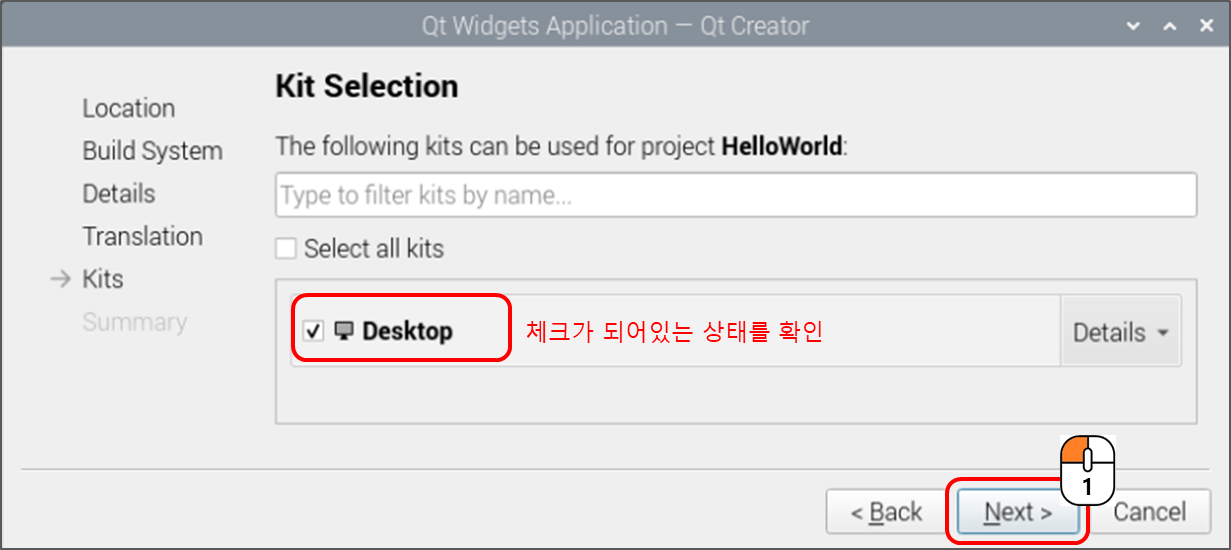 필자와 같이 QT를 설정했다면 아래의 그림과 같이 표시된다. detail을 누르면 어떤 컴파일러를 사용하는지, QT버전은 무엇인지 확인할 수 있다. 우리는 앞의 1.3 항목에서 이미 설정된 것을 확인했으므로 궁금하면 한번 클릭해서 보도록 하고 아닌 경우라면 Desktop에 체크된 상태로 다음으로 진행한다.