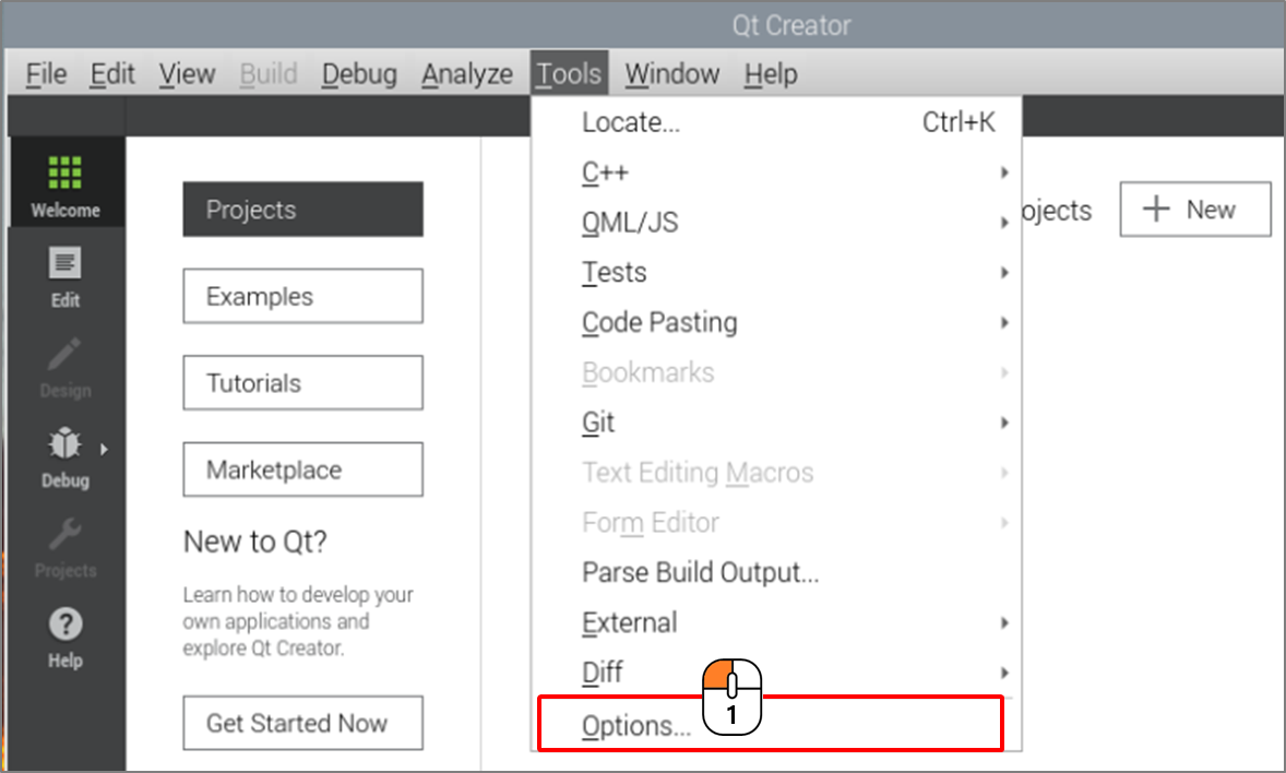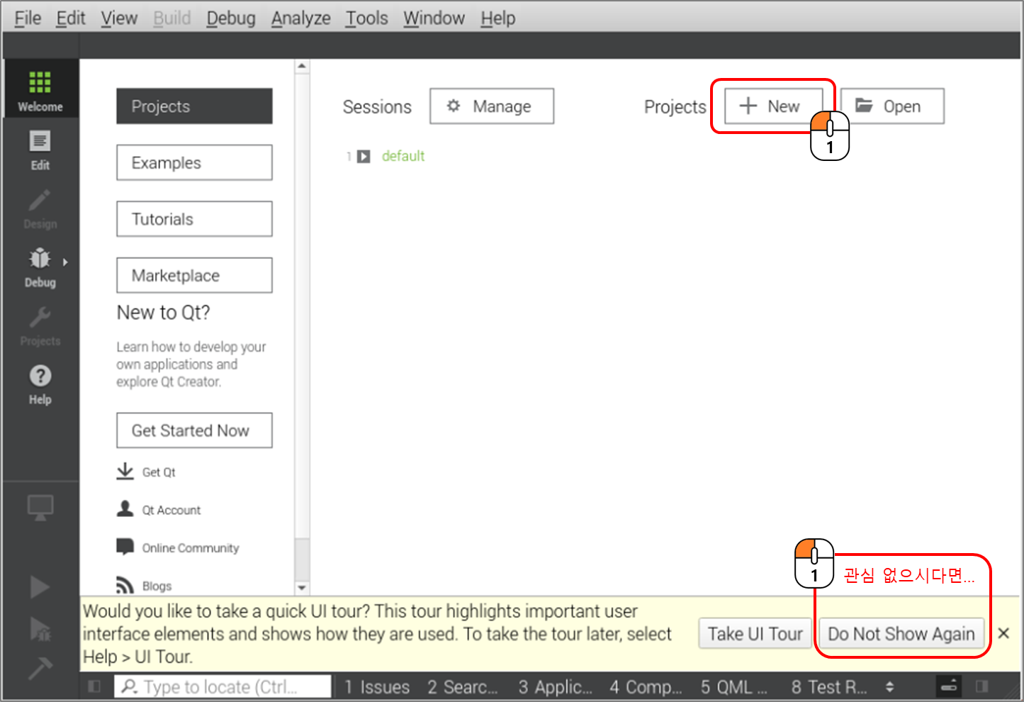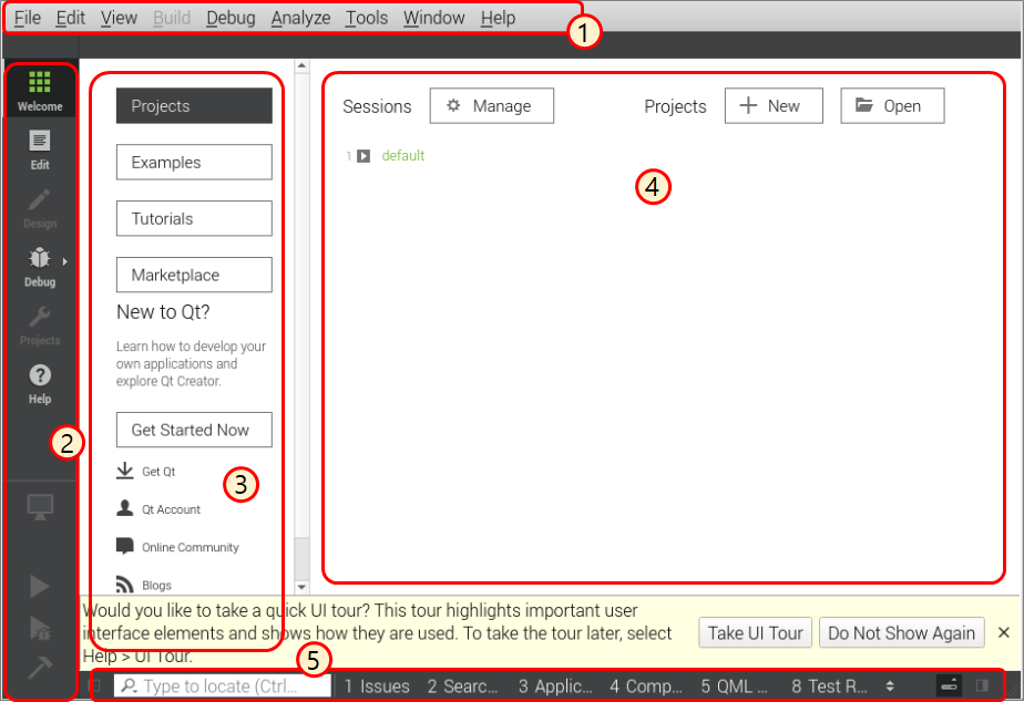 아래는 QT Creator가 시작되면 가장 먼저 표시되는 화면이다. 대부분의 프로그램들이 그러하듯 1번은 프로그램 메뉴, 2번은 프로그래밍과 실행을 위한 사이드메뉴, 그리고 내부는 2개의 프레임으로 나누어져 있는데, 3번은 프로젝트 및 관련 예제를 찾을 수 있도록 도움을 주는 기능을 포함하고있고, 4는 프로젝트를 열거나 삭제하는등의 기능을 가지고 있다. 그리고 하단부의 항목은 컴파일 및 빌드시 발생되는 메시지나 상태를 표시하는 텝으로 사용된다. 정식 며칭을 찾고 싶은데 그냥 검색해서는 확인이 어려워서 이후에 시간이 되는데로 정식 명칭대로 세부설명을 업데이트 하도록 하겠다.