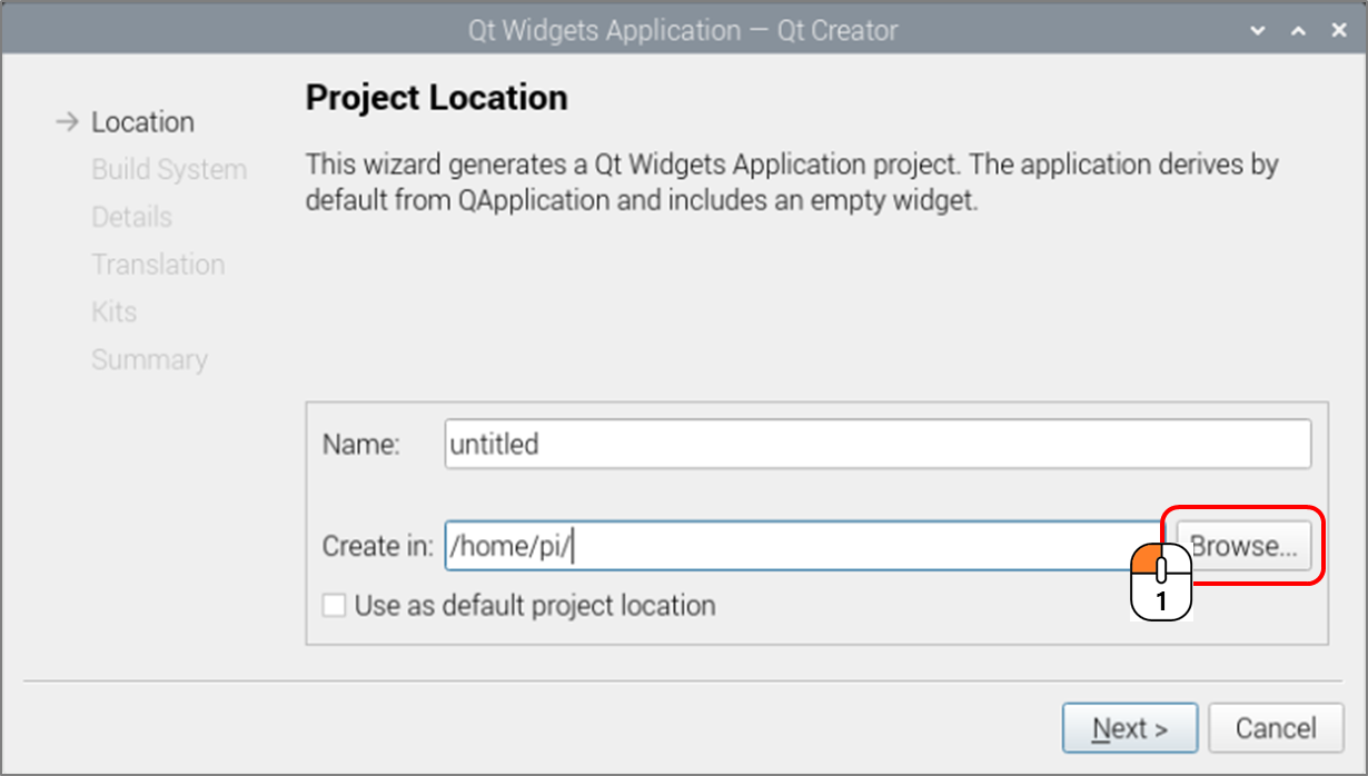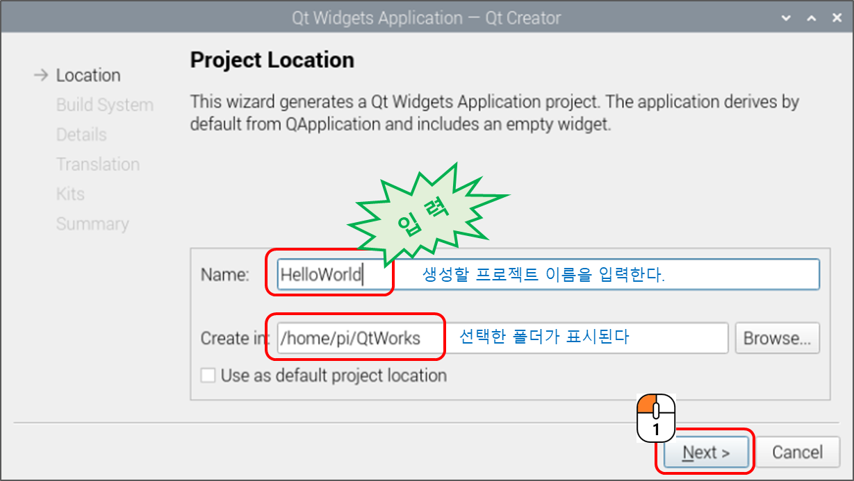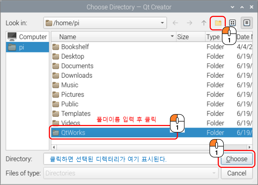 사용자 홈디렉터리가 표시되는 다이얼로그가 표시되면, 폴더모양의 아이콘을 눌러 QtWorks 디렉터리를 만든다. 그리고 생성된 QtWorks 디렉터리를 클릭해주고 Next 버튼을 클릭한다.