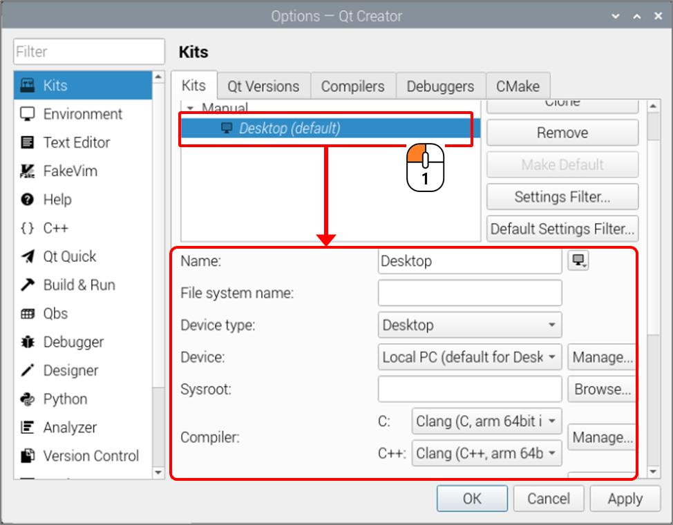 QT의 소스를 다운로드 받아서 직접 빌드한 독자의 경우, QT Creator를 실행했을 때, 컴파일러가 연결되지 않거나 관련 속성을 저장한 Kits가 없을 수 있다. 그런경우 메뉴를 통해서 Kits를 생성 후, 컴파일러등 빌드와 관련된 설정을 독자가 직접하여야 한다.