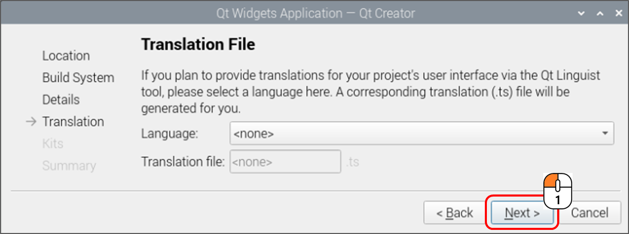 QT는 다양한 언어를 지원한다. 따라서 다국어를 위한 파일을 생성하면 실행하는 지역 또는 사용자 설정에 따라 다른 언어로 표시되게 끔 할 수 있다. 물론, 그러려면 아래의 화면에서 별도로 지정하거나 프로젝트 생성이후 별도로 ts파일을 생성해야 하는데, 필자는 영어를 좋아하진 않지만 QT를 하는 동안은 많이 좋아한다. 그러므로 none으로 설정후 다음으로 진행하도록 하자.