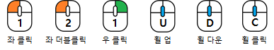 설명 부분에서 필자는 그림을 많이 사용할 수 있으므로, 마우스 클릭와 관련된 설명은 다음의 글 또는 다음의 그림으로 표시될 수 있다. 기억해 두도록 하자. 휠이 있는 3버튼 마우스 기준이다. 좌버튼, 우버튼, 휠로 구성된 마우스이며, 숫자는 클릭 회수를 나타내고 휠의 경우 Up, Down, Click으로 표시하였다. 사용할지 사용하지 않을지 모르지만 미리 설명해 둔다. 그건 그렇고, 필자가 그렸는데 잘 그렸다고 생각하지 않는가?