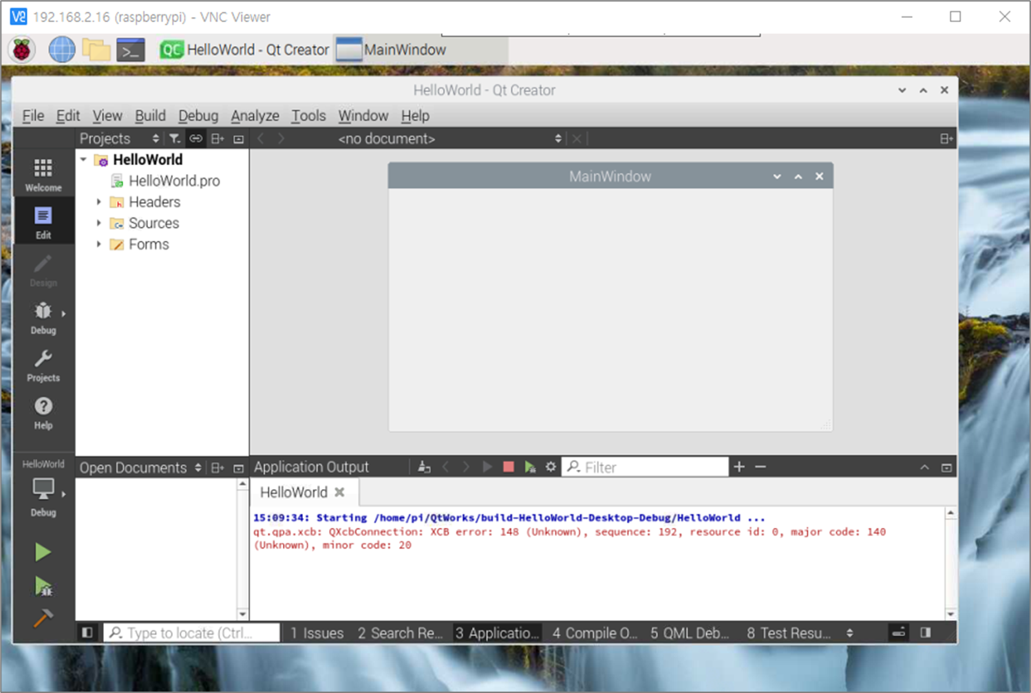 어쨋든, 필자 입장에서는 이러한 오류가 발생되지 않길 원하므로 삽질을 하던끝에 원인을 확인하였다. 필자는 라즈베리파이에 vnc 서버를 활성화 하고 VNC 플레이어를 통해서 프로그램이이나 제어를 한다. 왜냐면 캡쳐해야되니까. VNC에서 QT 샘플을 빌드하면 XCB오류가 발생된다. 그런데 실제 장치에서 다시 빌드하면 오류가 사라지는 것을 볼수 있었다.