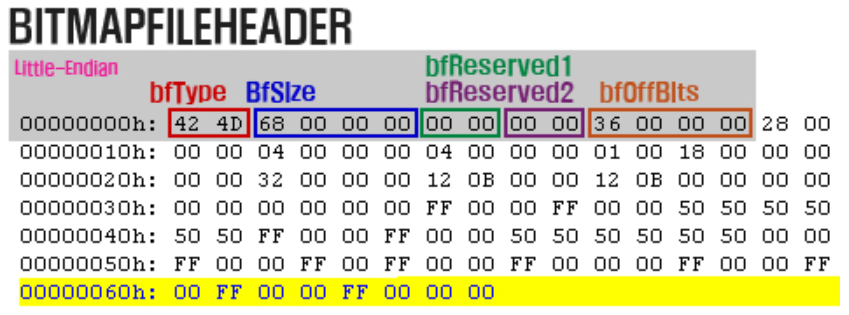 BMP는 Microsoft가 이미지 출력을 위해 고안한 이미지파일 포맷이다. 따라서 정상적인 데이터의 BMP 파일은 윈도우에서 미리보기 또는 그림판에서 확인 및 수정이 가능하다. 자세한 것은 wikipedia.org를 참고한다.