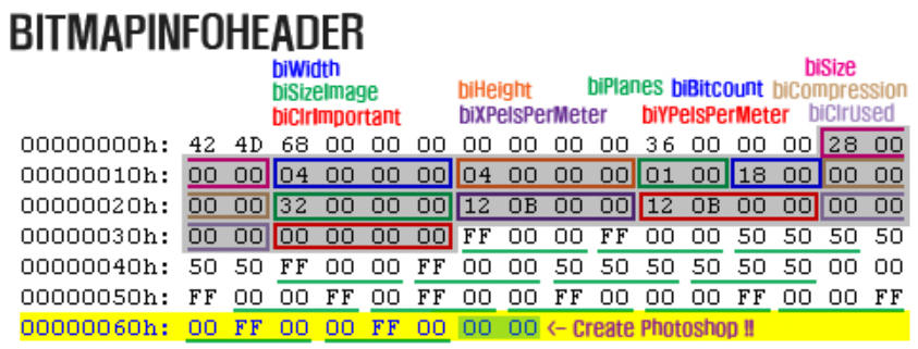 BMP는 Microsoft가 이미지 출력을 위해 고안한 이미지파일 포맷이다. 따라서 정상적인 데이터의 BMP 파일은 윈도우에서 미리보기 또는 그림판에서 확인 및 수정이 가능하다. 자세한 것은 wikipedia.org를 참고한다.