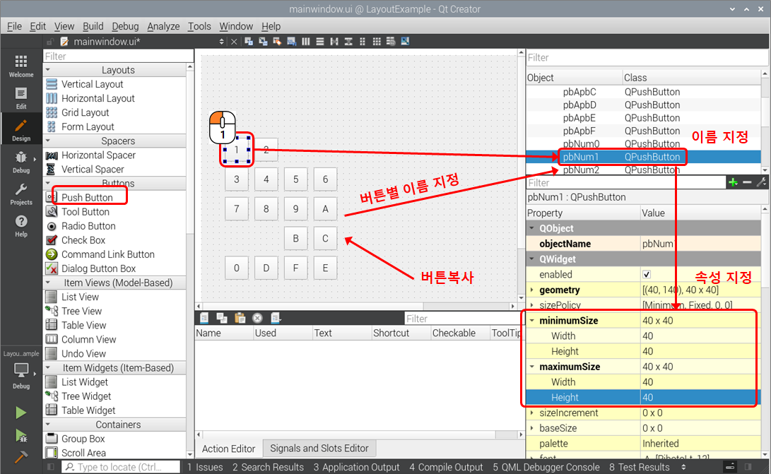 2) 놓여진 버튼을 클릭후 화면 우측의 속성에서 minimumSize와 MaximumSize에서 Width와 Height를 각각 40으로 설정한다. 그리고 이름을 pbNum1로 만들자.