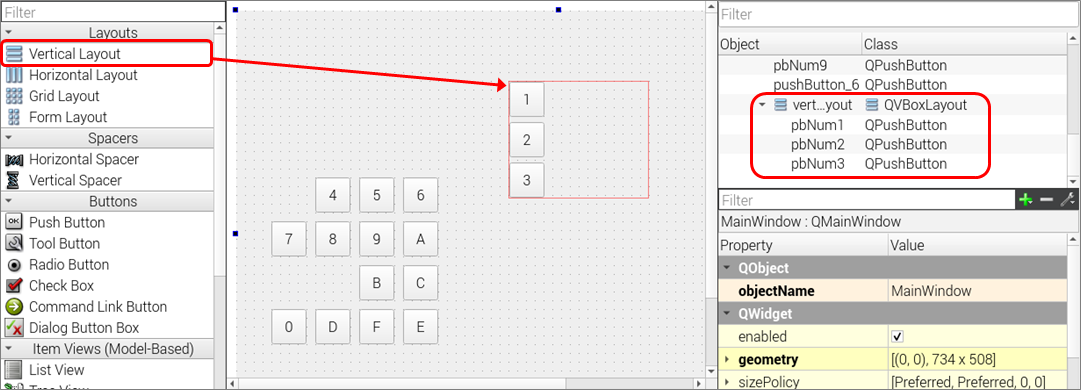 3) 중앙의 Vertical Layout을 클릭하여 움직이면 버튼 1~3이 같이 포함되어 움직이는 것을 확인할 수 있다.