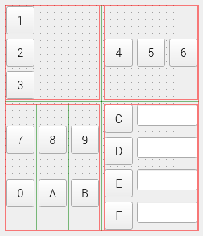 위의 레이아웃은 중첩해서 사용이 가능하다. 예를들면 앞서 만든 4개의 레이아웃을 다시 Grid Layout에 넣으면 다음과 같이 표시할 수 있다.