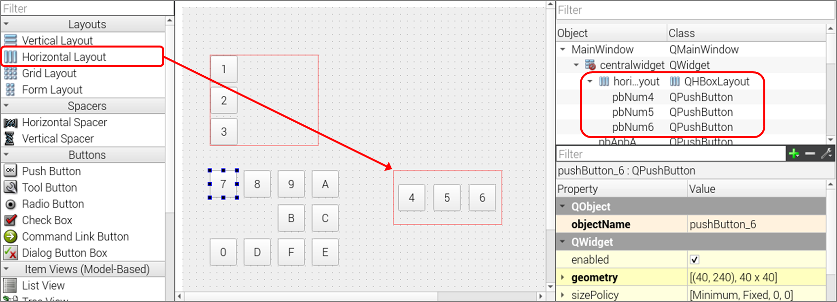 2) 화면 우측의 구성에서 새로생성된 horizontal 레이아웃 아래에 푸쉬버튼 pnNum4~6이 포함됨을 알수있다.