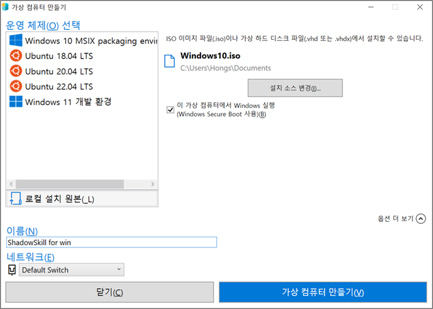 리스트에 설치하고자 하는 운영체제가 없으면 "로컬 설치 원본"을 클릭하고 운영체제 이미지파일이 있는 경로에서 설치할 이미지를 선택한다. 필자는 Windows이미지를 다운로드 받았고, 해당 이미지를 선택하였다. 그리고 "옵션 더 보기"를 선택하여 가상머신의 이름을 지정해주었다.