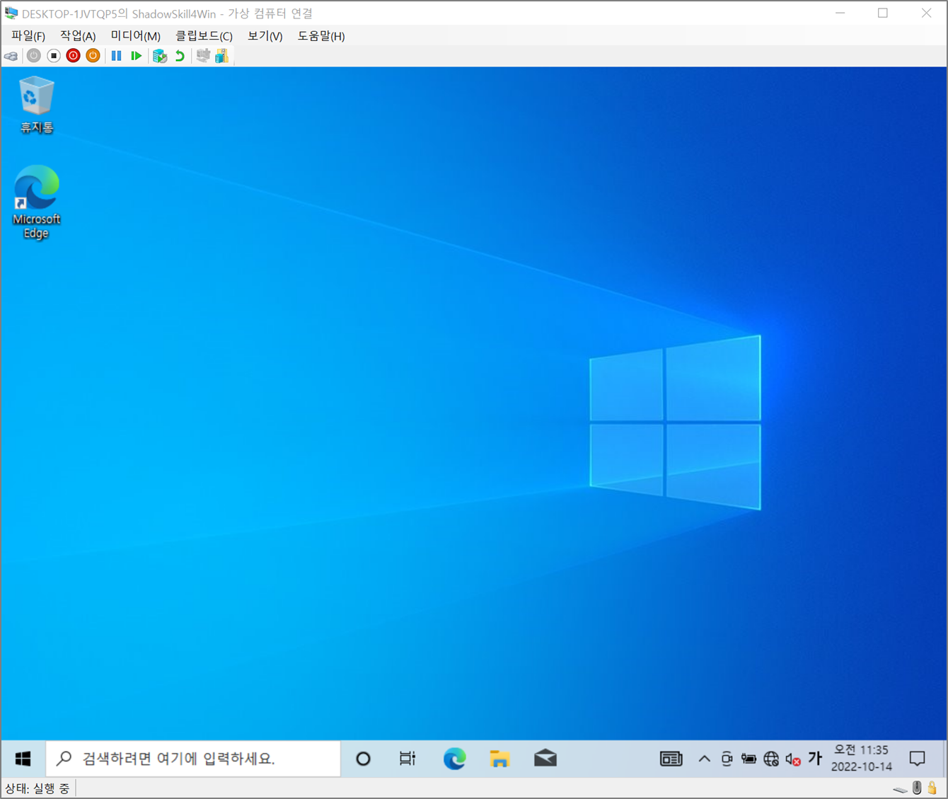가상 머신을 연결하면 이제 등록된 windows10.iso를 가상 DVD로 인식하여 설치를 시작한다. 정상적으로 설치가 되었다면, 재부팅 되면서 Windows가 실행되는 것을 확인할 수 있다.