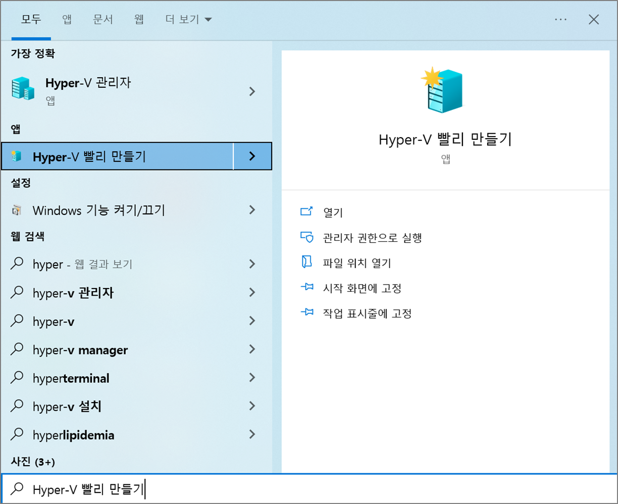 시작버튼을 눌러서 Hyper-V를 입력하고 빨리 만들기를 선택하여 실행한다.