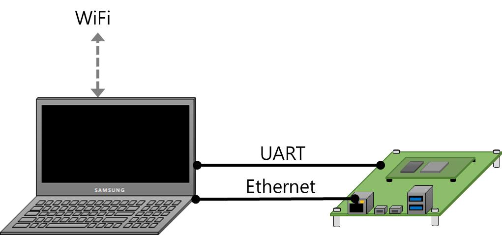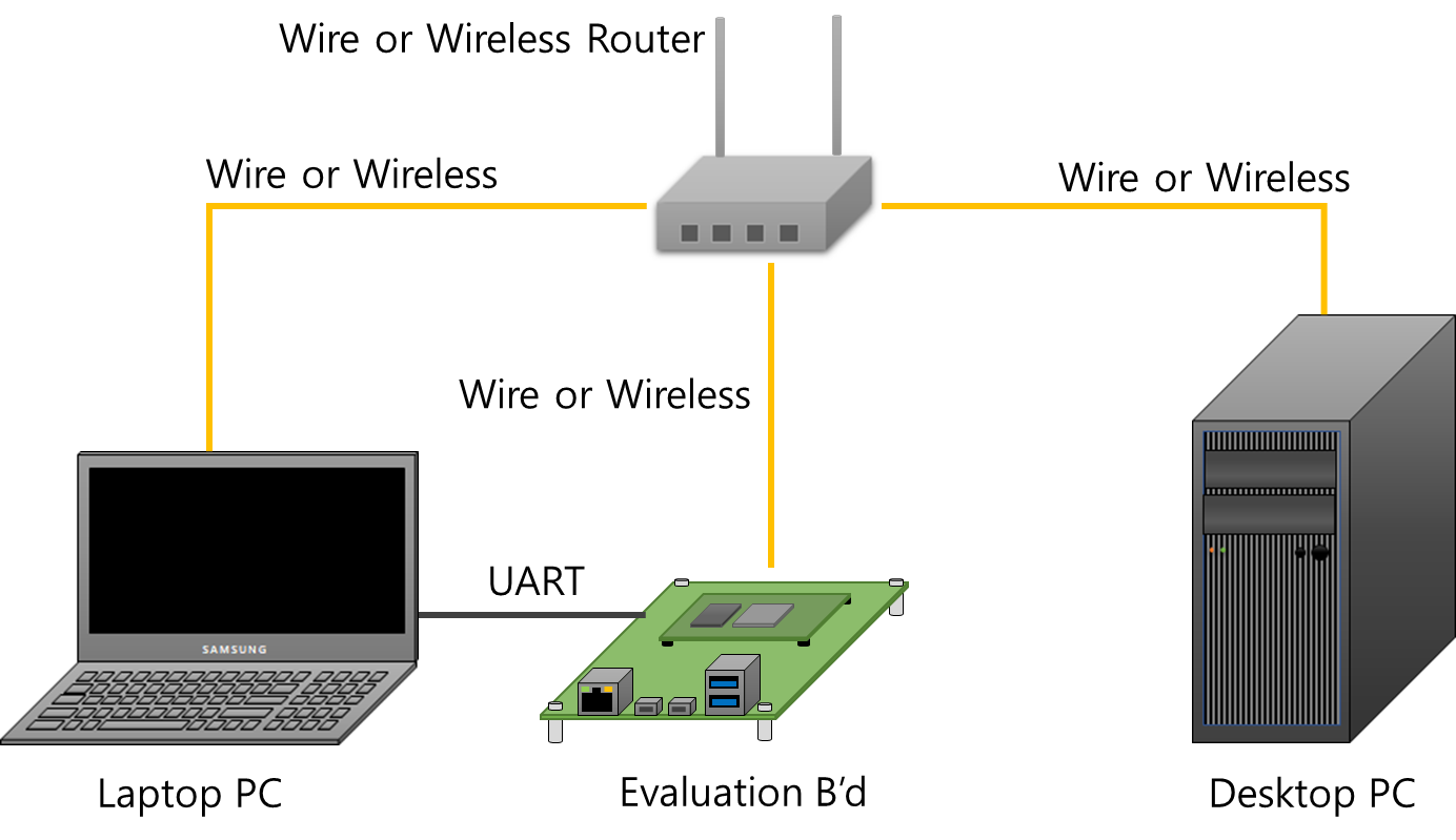 앞서 내용과 별 다른 것은 없지만 데스크탑 PC또는 서버와 개발자의 노트북, 개발보드를 하나의 네트워크에 물려 놓고 사용한다. 이때 네트워크는 무선 공유기등을 이용해서 유선이던 무선이던 연결 시키고, 디버그 포트만 개발자의 호스트(랩탑)과 연결하여 사용한다.
