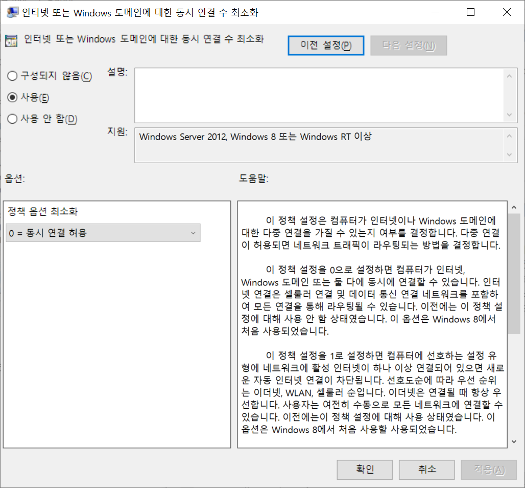 2.3. 인터넷 또는 Windows 도메인에 대한 동시 연결 수 최소화 선택