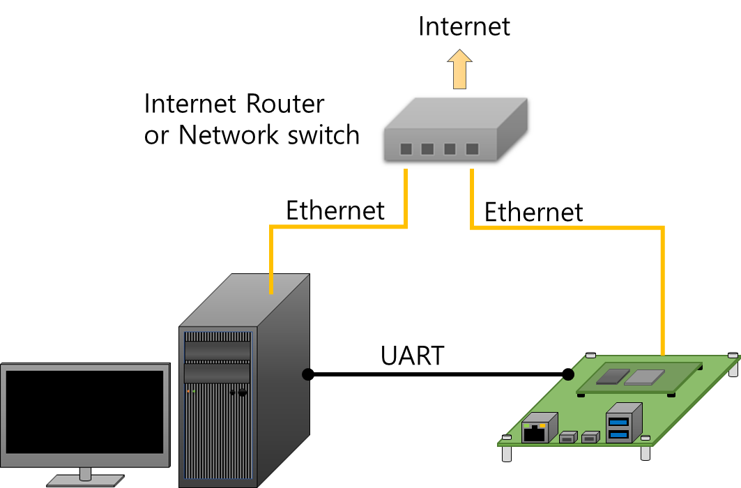 호스트 컴퓨터에서는 임베디드 장치의 디버그 메시지를 위해 UART를 연결하고 각 장치는 네트워크 스위치나 인터넷 공유기를 통해 내부 네트워크로 연결하여 사용하는 방법으로 현재에도 가장 많이 사용하는 방법이다. 물론 ssh등을 이용한 경우 UART를 연결하지 않아도 되겠지만 개발 초기라면 부팅때 발생하는 메시지가 디버깅에 도움이 되므로 개발 장비는 개발자의 호스트 P에 가까이 있을 수 밖에 없다.
