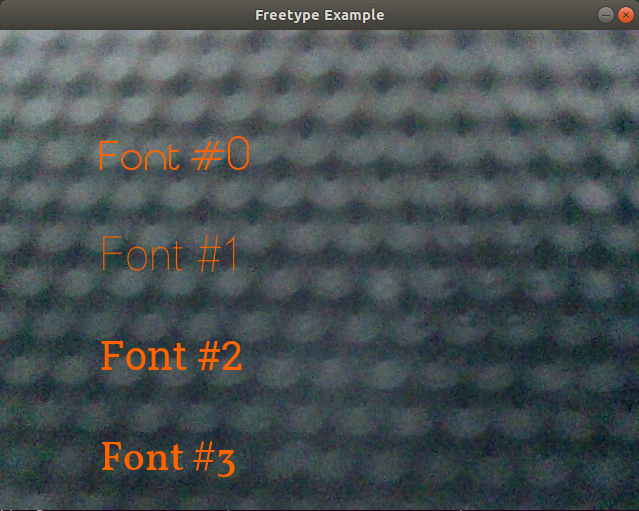 ft2ext0->putText(img_frame,"Font0",Point(100,100),40,Scalar(0,100,255),-1, LINE_AA, false);