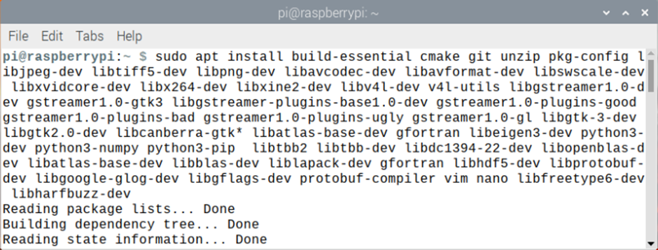 $ sudo apt install build-essential cmake git unzip pkg-config libjpeg-dev libtiff5-dev libpng-dev libavcodec-dev libavformat-dev libswscale-dev libxvidcore-dev libx264-dev libxine2-dev libv4l-dev v4l-utils libgstreamer1.0-dev gstreamer1.0-gtk3 libgstreamer-plugins-base1.0-dev gstreamer1.0-plugins-good gstreamer1.0-plugins-bad gstreamer1.0-plugins-ugly gstreamer1.0-gl libgtk-3-dev libgtk2.0-dev libcanberra-gtk* libatlas-base-dev gfortran libeigen3-dev python3-dev python3-numpy python3-pip libtbb2 libtbb-dev libdc1394-22-dev libopenblas-dev libatlas-base-dev libblas-dev liblapack-dev gfortran libhdf5-dev libprotobuf-dev libgoogle-glog-dev libgflags-dev protobuf-compiler vim nano libfreetype6-dev libharfbuzz-dev