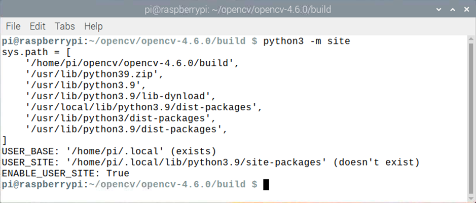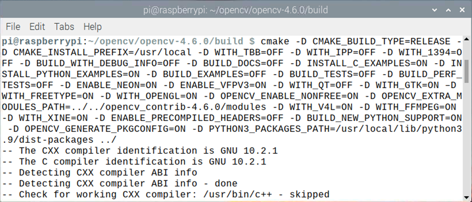 cmake -D CMAKE_BUILD_TYPE=RELEASE -D CMAKE_INSTALL_PREFIX=/usr/local -D WITH_TBB=OFF -D WITH_IPP=OFF -D WITH_1394=OFF -D BUILD_WITH_DEBUG_INFO=OFF -D BUILD_DOCS=OFF -D INSTALL_C_EXAMPLES=ON -D INSTALL_PYTHON_EXAMPLES=ON -D BUILD_EXAMPLES=OFF -D BUILD_TESTS=OFF -D BUILD_PERF_TESTS=OFF -D ENABLE_NEON=ON -D ENABLE_VFPV3=OFF -D WITH_QT=OFF -D WITH_GTK=ON –D WITH_FREETYPE=ON -D WITH_OPENGL=ON -D OPENCV_ENABLE_NONFREE=ON -D OPENCV_EXTRA_MODULES_PATH=../../opencv_contrib-4.6.0/modules -D WITH_V4L=ON -D WITH_FFMPEG=ON -D WITH_XINE=ON -D ENABLE_PRECOMPILED_HEADERS=OFF -D BUILD_NEW_PYTHON_SUPPORT=ON -D OPENCV_GENERATE_PKGCONFIG=ON -D PYTHON3_PACKAGES_PATH=/usr/local/lib/python3.9/dist-packages ../