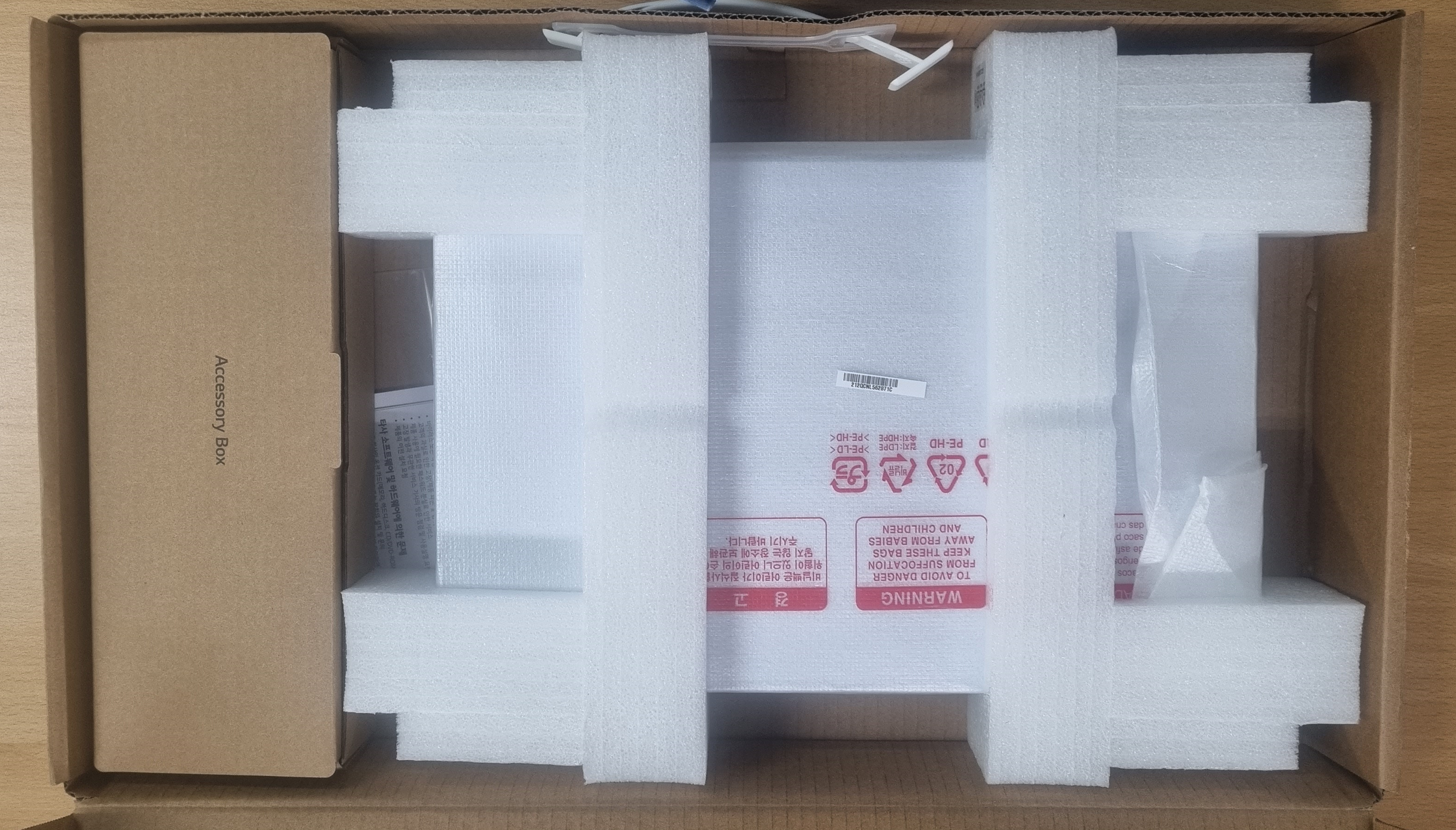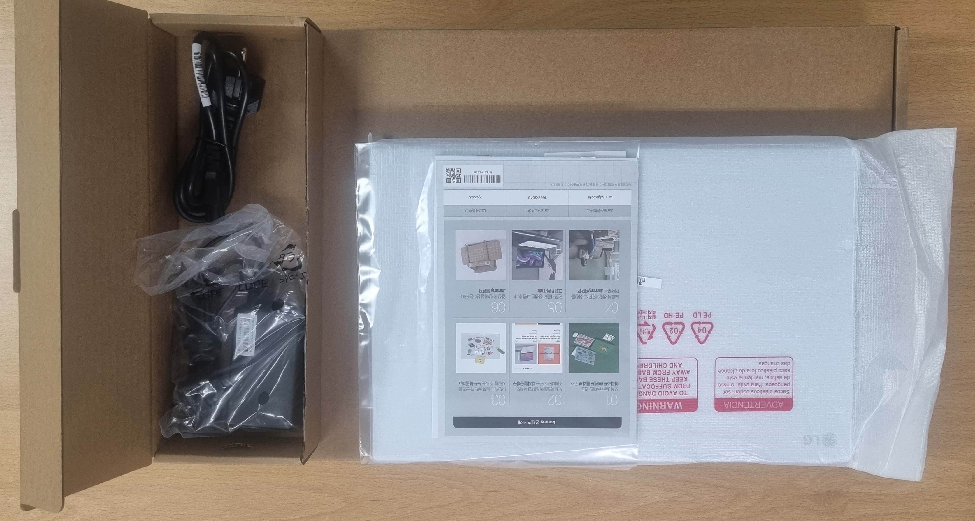 좀더 자세히 보기 위해서 악세서리 박스를 열어봤더니... 전원 케이블만 있다. 그리고 박스아래에 보증서랑...
