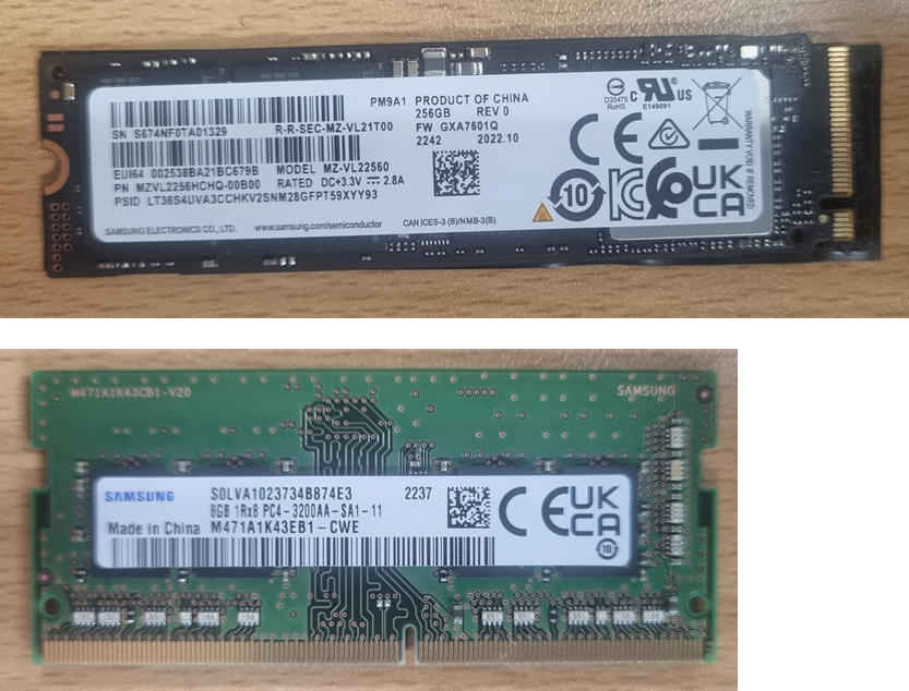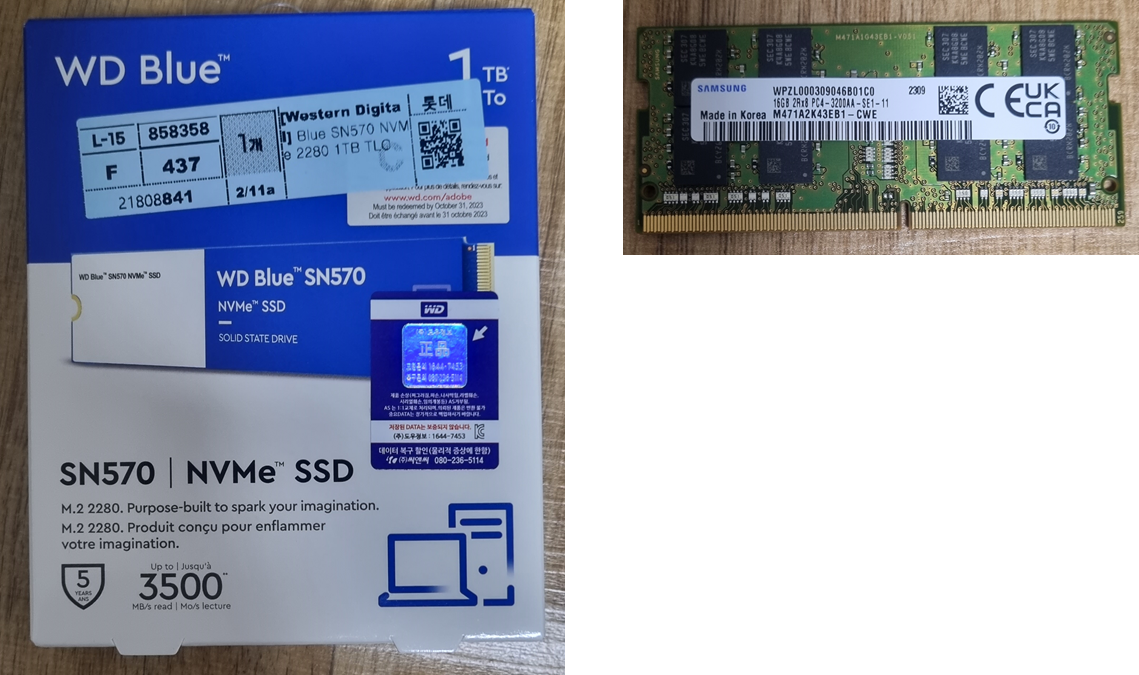 우선 SSD는 집에 구럴다니는 4개의 256GB SSD중 하나를 사용하기로 하고, 램은 16GB 하나 사야될거 같고, 그리고 NVME 1TB정도만 추가해주는 선에서 마무리 하고자 하였다. 아 그전에 이번 LG에 채택된 기본품들은 조금 의아했다. 예전에는 하이닉스 또는 인피니언이었는데... 뭐 어쨋거나 LG노트북을 뜯어본 후로 SSD와 RAM이 삼성이었던 적이 없었던것 같은데... 물론, 모든 제품을 뜯어본 것은 아니었지만... 램은 상용구매 제품과 동일했고, SSD 라벨은 조금 달라보이는 것으로 봐서 B2B로 예상하고 있다. 그리고 PCIe Gen4용이다.