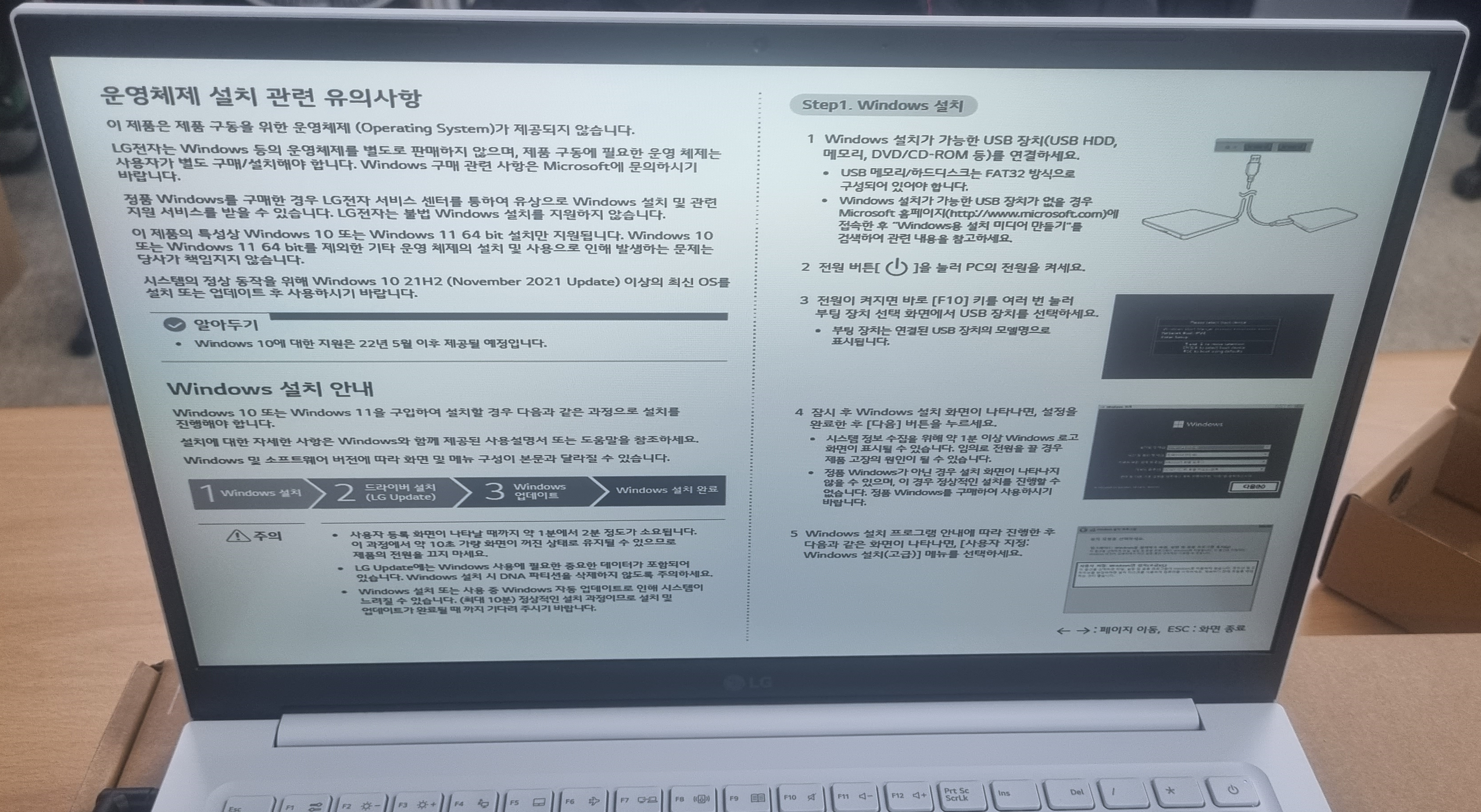 다 흰색인데 LCD 베젤은 검은색이다. 필자가 받았을 때는 노트북은 이미 방전상태여서 어느정도 충전해주고 전원을 인하가였다. 해당 제품은 운영체제 미 포함옵션이라 아래와 같이 운영체제 설치 관련 안내가 표시된다.