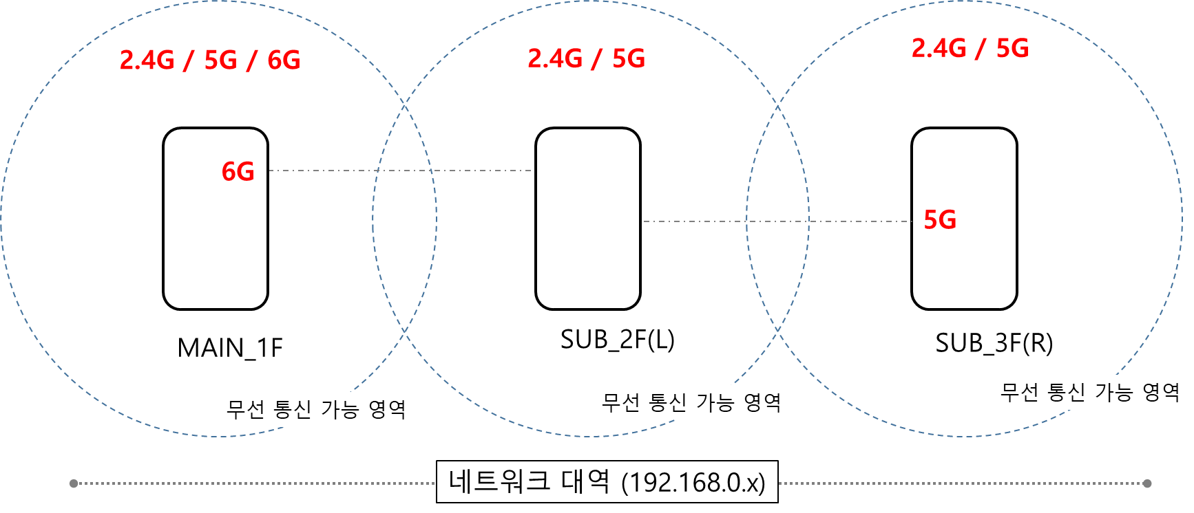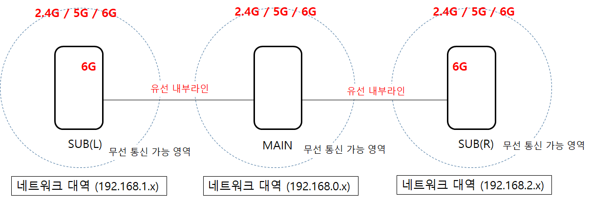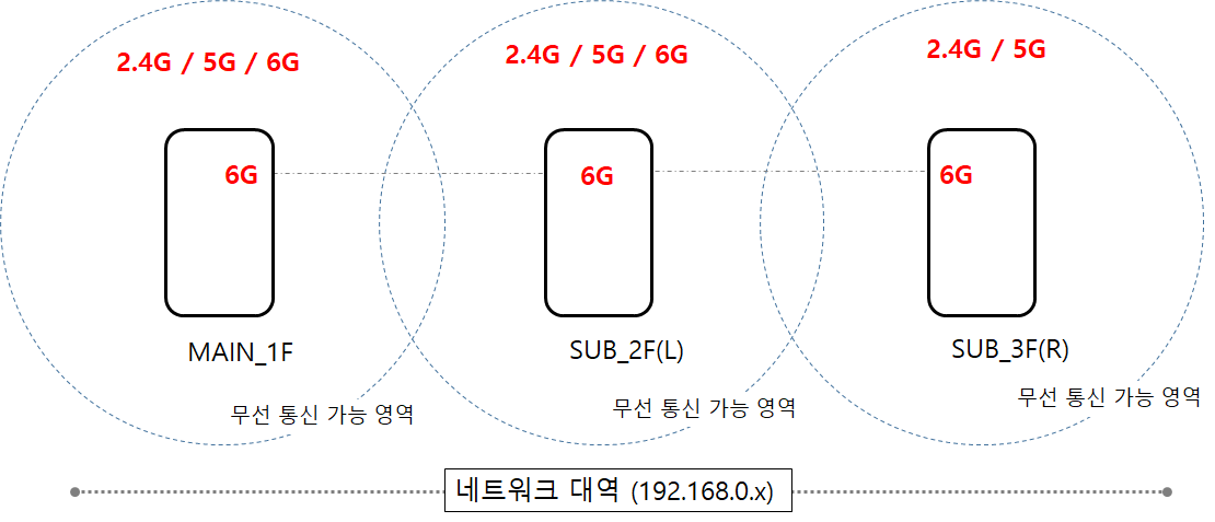 뭐 어쨋거나 필자가 요청 받은건 무선으로 연결이다. 따라서 이런 형태로 연결된다. 이 경우에는 메인 공유기가 가운데 있어야 한다. 왜냐면, 공유기가 각각 켜지면서 6G ESSID를 찾아 연결하게 되기 때문이다.