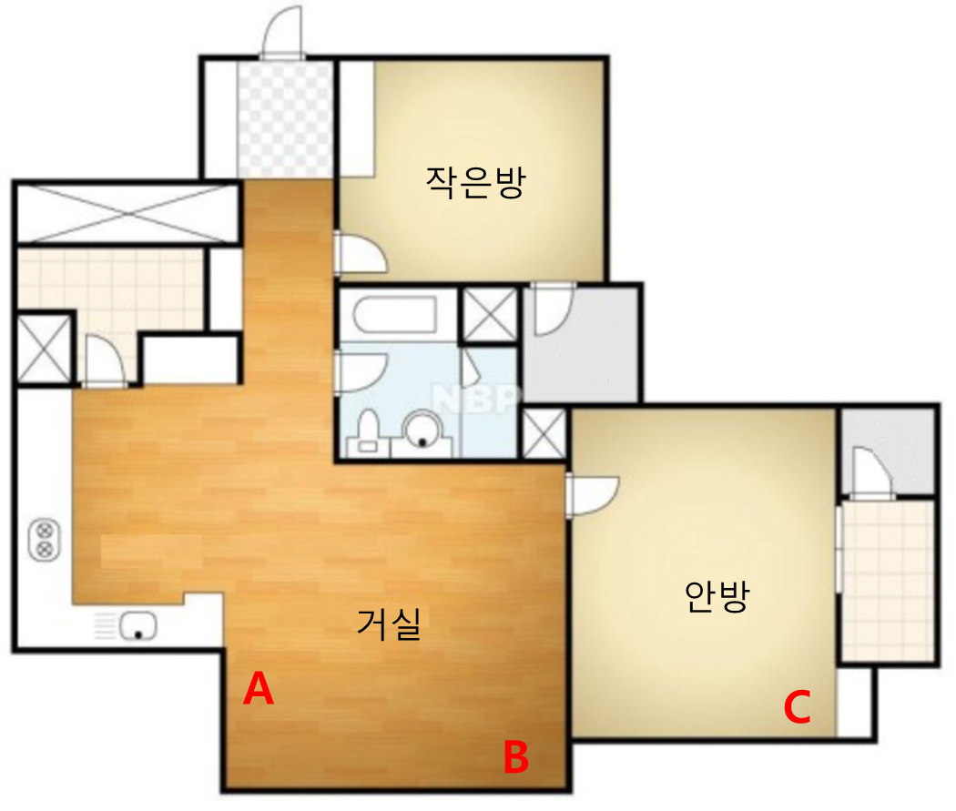 자, 우선 평면도를 보고 이야기 해보자. 유선을 사용할 수 있는 집이라면 아무런 문제가 발생되지 않는다. 매립형으로 깔끔하게 되어있다면 그런데 그런상황이 아니면 작은방에 입주한나는 마누라에게 보기 싫은 유선줄을 실내로 배선할 수도 없다. 그런경우 유일한 방법이 무선인데 아래의 각각 A, B, C위치에 인터넷 모뎀과 공유기가 설치된다고 가정하면 어떤 위치가 가장 좋을까? 물론, 집이 좀더 넓다고 가정하면서 생각해야 한다. 예를들면 거실 20평, 안방 10평 작은방 6평이정도? (아따 이 양반 잘사네... 하면 안된다 필자의 집은 너무 좁다...)