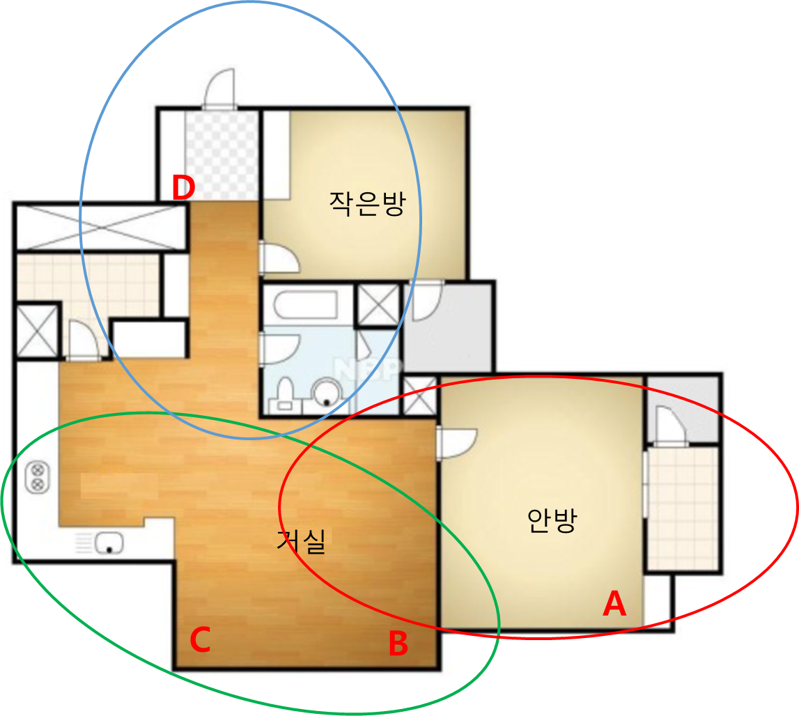 따라서, A나 B에 설치된 모뎀에서 필요하면 D영역 부근또는 부억 벽면 부근에서 한번더 확장 해주는 것이 좋을것같다. 앞에서도 이야기 했지만 모든건 측정후에... 필자의 집이 대략 이런식으로 구성되어있다. 작은방 끝에서는 잘 안터져서말이다. 자기전에 폰이 있어야되는 위치까지 신호가 안와서...