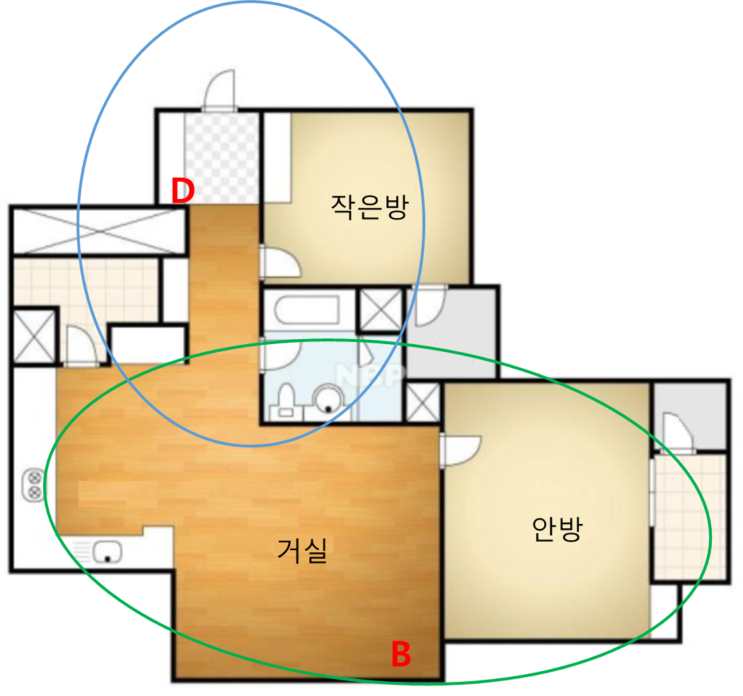 따라서, A나 B에 설치된 모뎀에서 필요하면 D영역 부근또는 부억 벽면 부근에서 한번더 확장 해주는 것이 좋을것같다. 앞에서도 이야기 했지만 모든건 측정후에... 필자의 집이 대략 이런식으로 구성되어있다. 작은방 끝에서는 잘 안터져서말이다. 자기전에 폰이 있어야되는 위치까지 신호가 안와서...