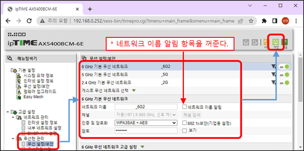 따라서, [무선 설정/보안] 항목에서 각각의 무선 네트워크는 Main의 네트워크 이름과 동일(동일한 이름으로 핸드오버 되게하기 위함, 지원되는 모델에 한함)하게 설정한다. 다만, 6G만 다른 이름으로 설정한다. 필자는 6G2(SUB-L)와 6G3(SUB-R)로 구분하였다. 그리고 6G에 대한 네트워크 이름 알림을 꺼주어야 깔끔하게 위의 그림과 같은 구조가 된다.