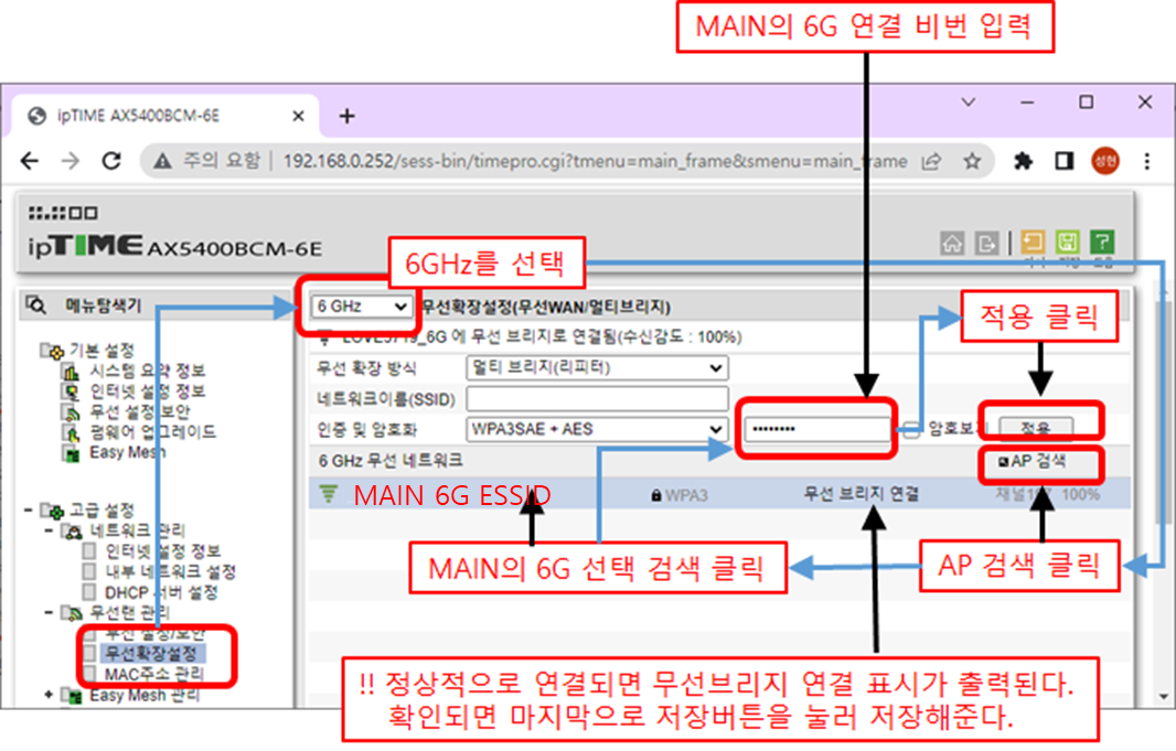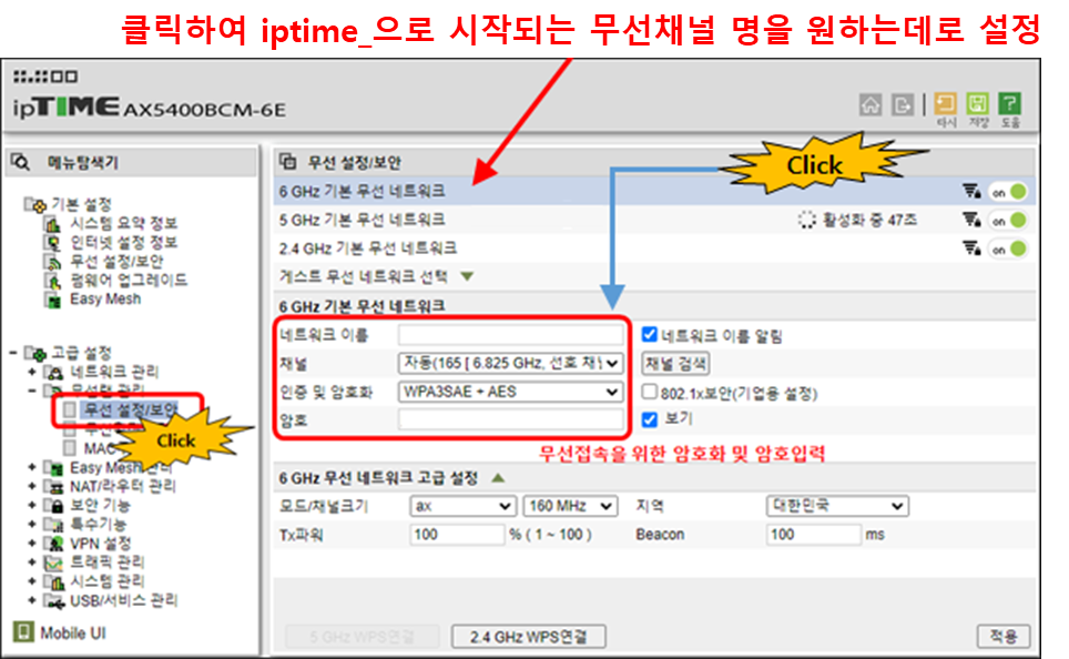 - 6Ghz클릭후 네트워크 이름을 적당히 입력하고, WPA3SAE + AES로 지정후 암호 입력한 다음 적용버튼 클릭