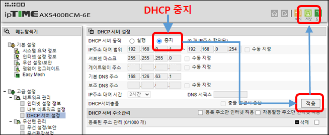 DHCP는 Main 공유기만 작동되어야 하므로, 서브 공유기들은 모두 DHCP 기능을 중지해야 한다. 아니면 IP 자동 할당하다 문제가 발생될 수 있다.