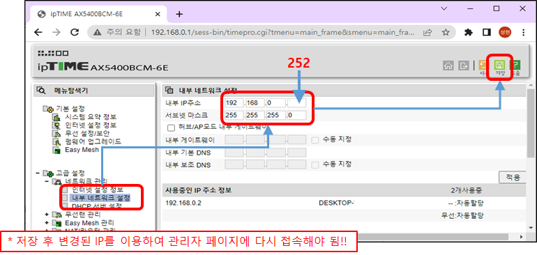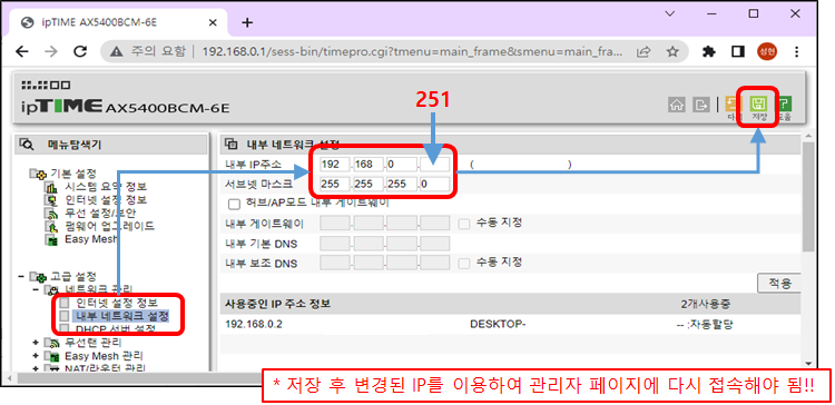 필자는 공유기는 250번 뒤로 미룬다. 그리고 네트워크 장치는 그 앞의 번호를 쓰게 한다. 편하신데로 하시면 되겠다. 필자의 Main 공유기는 251번이다.