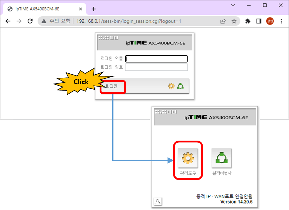 초기 로그인 이름(ID)는 admin, 암호도 admin이다. 로그인 해주면 관리도구와 설정 마법사가 나온다. 간단한 설정은 마법사를 통해서 하고, 있어보이려면 관리도구를 클릭한다.