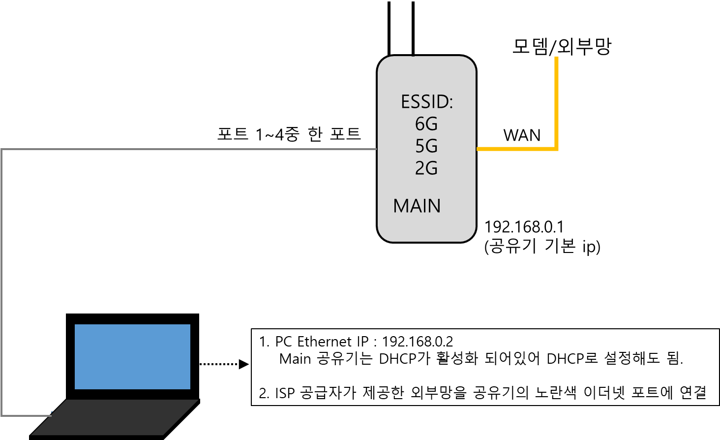 * 최초 설정때는 Main에 연결하지 않고, 공유기와 PC를 1:1로 연결하여 설정한다.