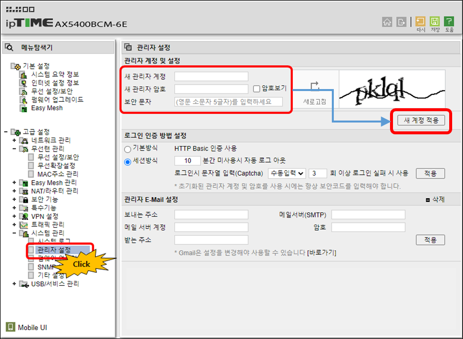 관리도구에서 가장먼저 할일은 관리자 ID 및 패스워드 설정이되시겠다. 원하시는데로 설정한다. 만약 잊어벼렸다면 기기 전원 빼고 리셋버튼 핀으로 누르고 전원 꼽고 10초뒤 공장초기화된 다음 다시 하면된다.
