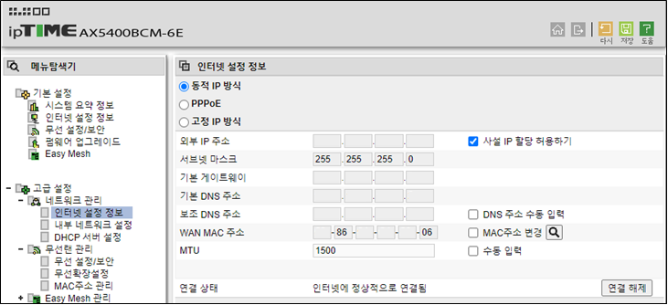 특별한것 없다. 동적 연결 선택되어있으면 넘어가면되고, 안되어있음 동적 설정 클릭하고 저장해준다. 아래 외부주소나 MAC 주소는 문제가 될수 있어 깨끗하게 지웠다. 독자들 PC에서는 출력될 수 있다.