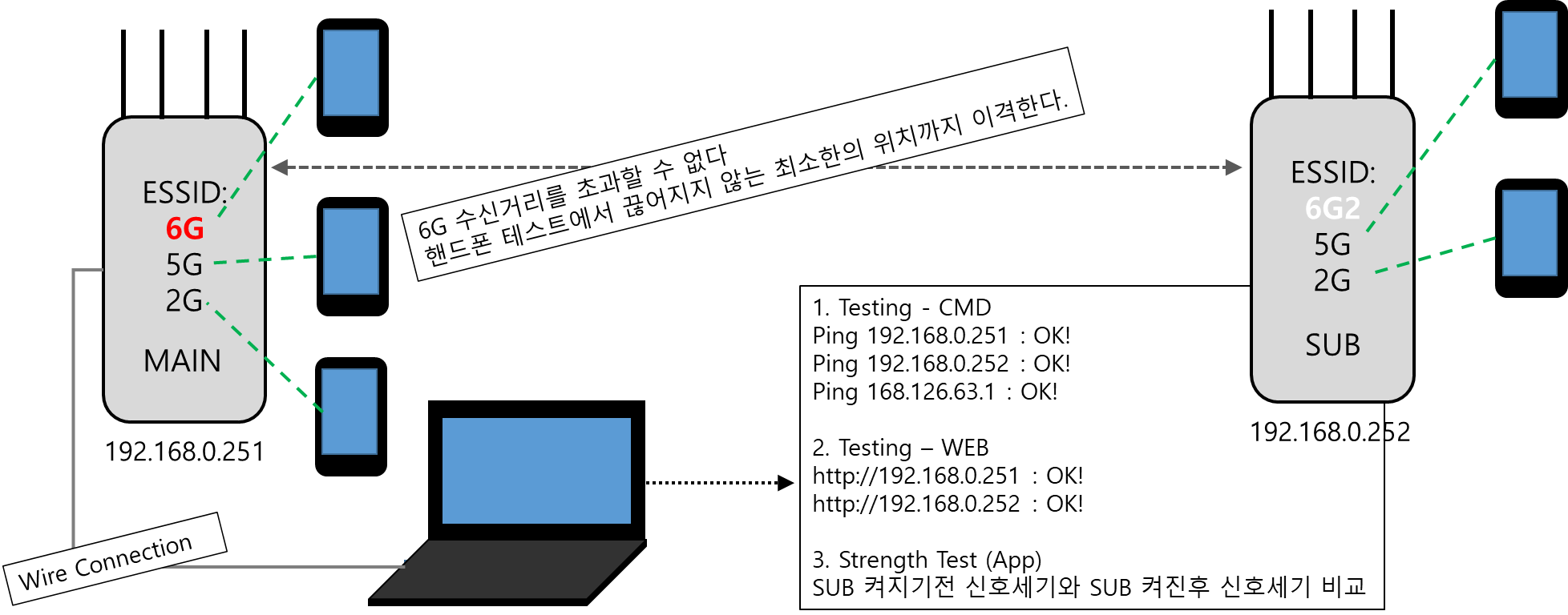 다음으로는, 이전에 게시물에서 필자가 언급한 무선 연결 구조는 아래와 같다. 서브 공유기에서는 6G ESSID를 알리지 않는다. 따라서 Main 공유기 영역에서만 트라이밴드(2.4/5/6Hhz) 모두 공개하고 SUB 지역에선 듀얼밴드 ESSID를 공개한다.